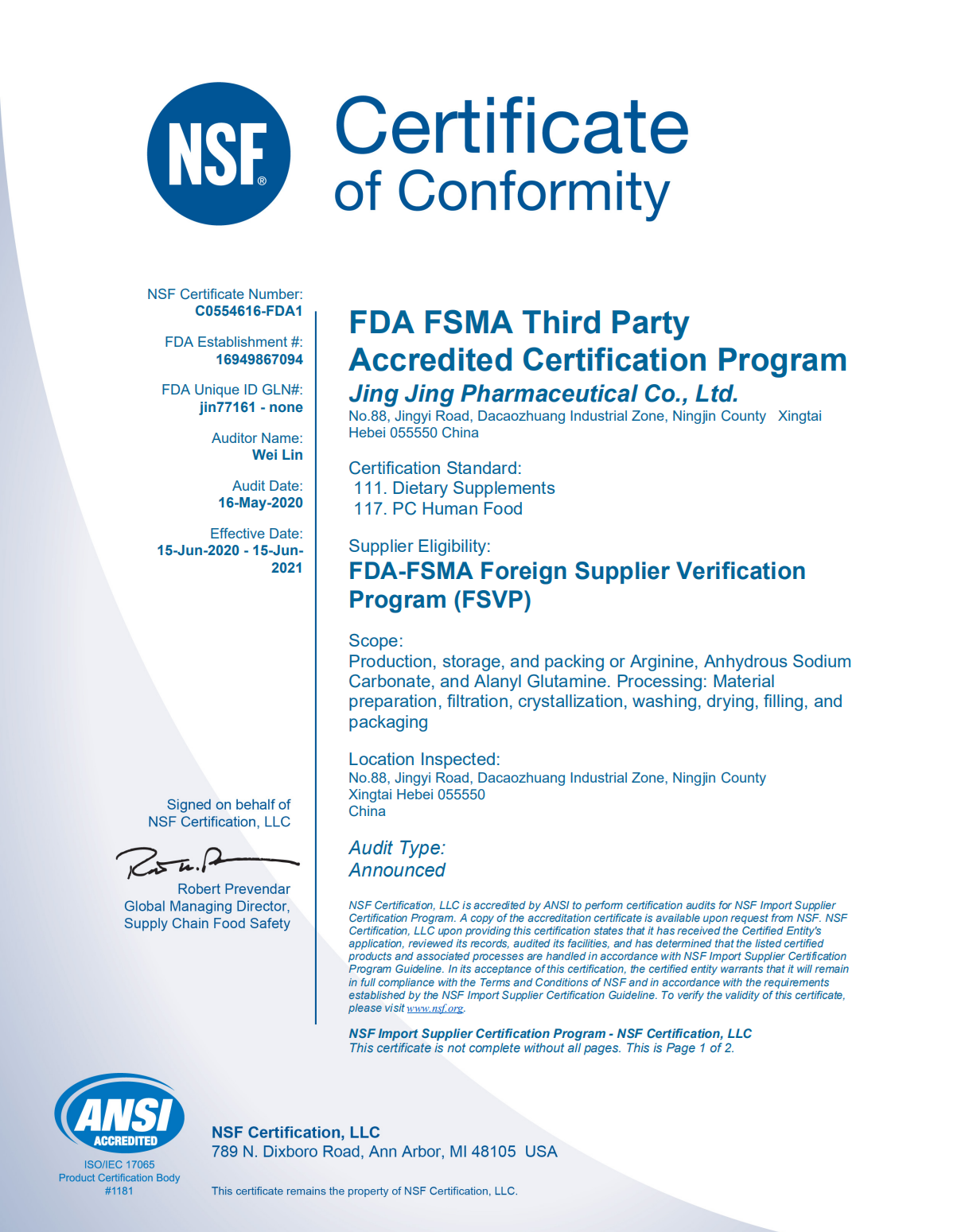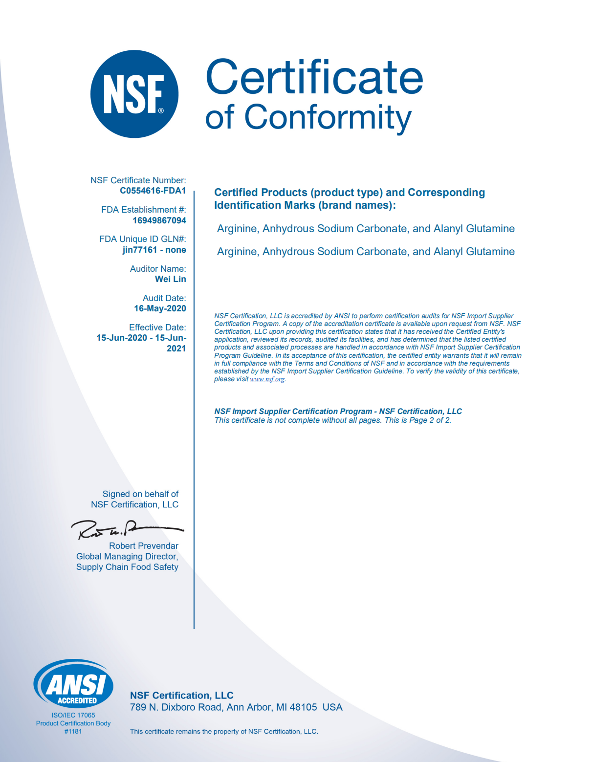 我公司产品精氨酸、无水碳酸钠和丙氨酰谷氨酰胺于2020年06月15日获得美国FDA认可的第三方认证机构NSF下发的FDA-FSMA FSVP(国外供应商验证计划)证书,符合FDA颁布的《联邦法规》第21章 117部分(PC Human Food)和111部分(Dietary Supplements)。